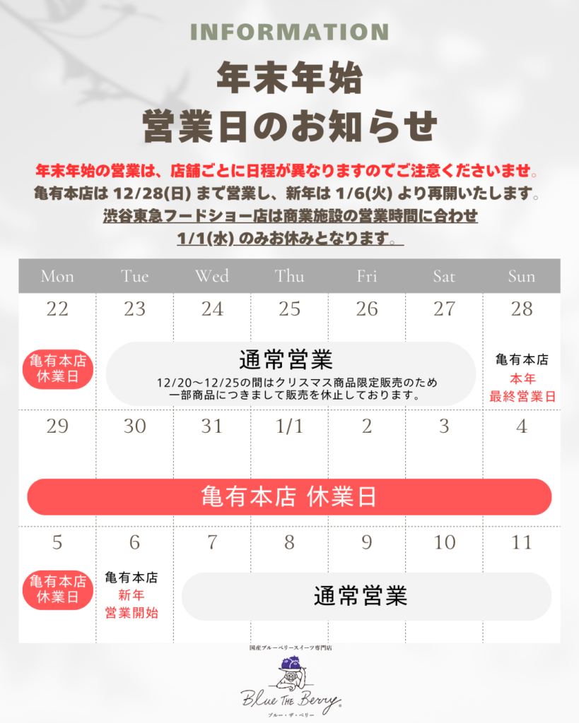 亀有本店・渋谷東急フードショー店では、店舗により営業日が異なります。