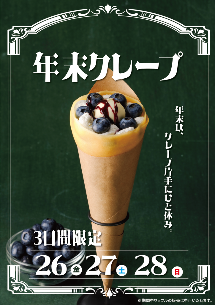 12 162025 年末クレープ開催します! お知らせ Share 年末クレープフェア開催のお知らせ 今年も一年の最後の締めくくりは年末限定クレープフェアを開催いたします。12/26(金)〜12/28(月)の期間中、ちょっと特別な甘い時間をお楽しみください。皆さまのご来店を心よりお待ちしております。 Share この記事のタイトルとURLをコピーする 年末年始営業のお知らせ 前の記事