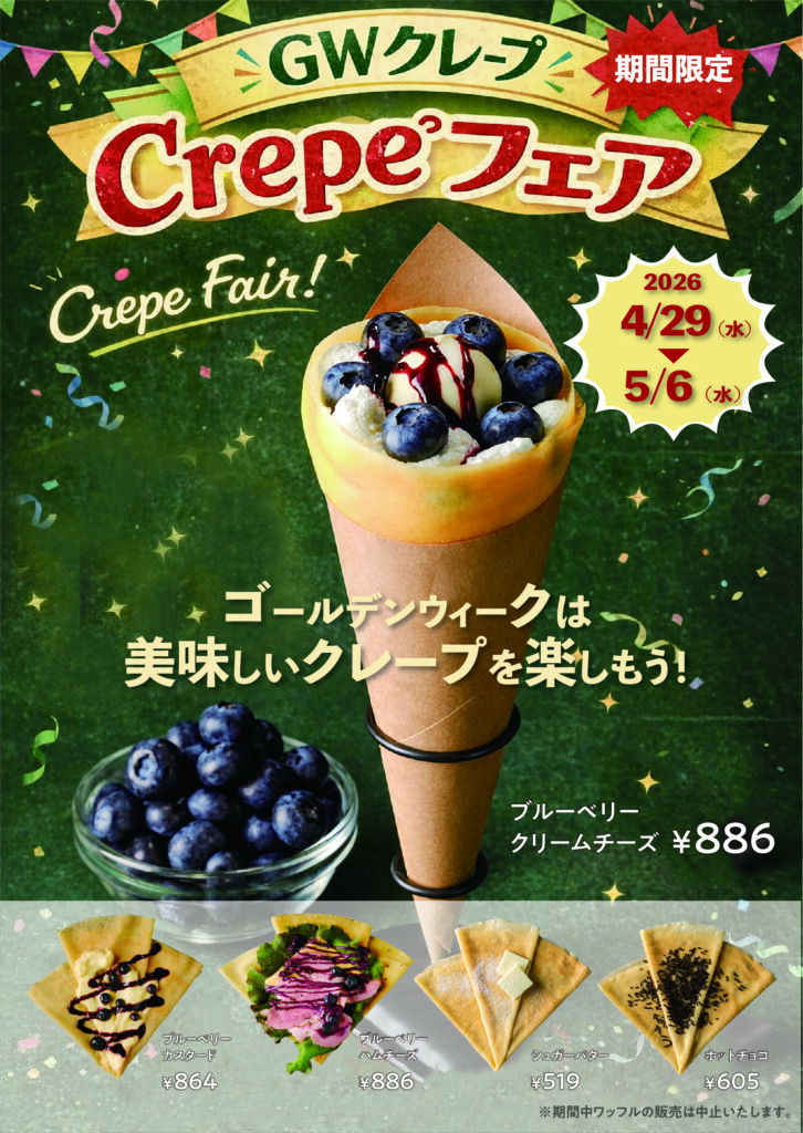 4月29日(水)〜5月6日(水)のゴールデンウィーク期間中、亀有本店にて「クレープフェア」を開催いたします!